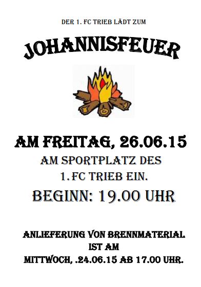 Johannisfeuer 2015 Herzliche Einladung an alle Mitglieder und Einwohner von Trieb zum Johannisfeuer am Freitag, 26.06. ab 19 Uhr am Sportgelände des 1.FC Trieb! Für das leibliche Wohl ist gesorgt 😉
